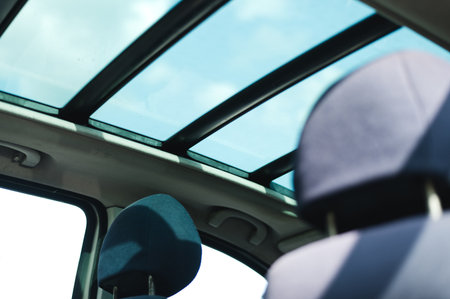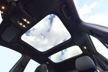 View of the ceiling of the car with a transparent glass hatch for airing, opening so that you can see the sky and clouds in the gray cabin of the vehicle. Sunroof on beige roof.