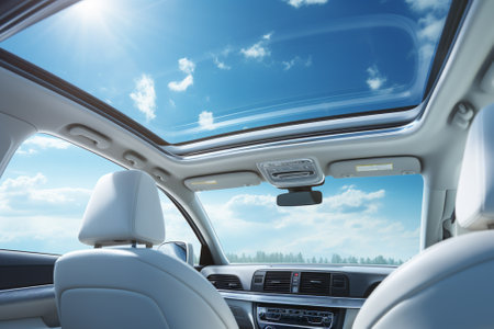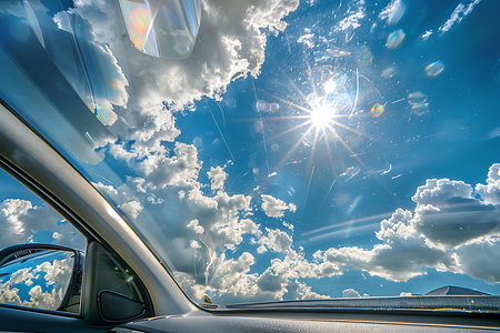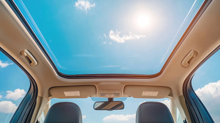 Enjoy a breathtaking view of the clear blue sky and fluffy clouds through the sunroof of a car. Experience the joy of open air driving on a sunny day.