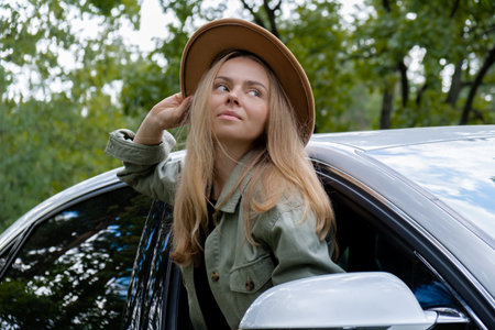 Smiling young woman in hat looking from car window. Local solo travel on weekends concept. Exited woman explore freedom outdoors in forest. Unity with nature lifestyle, rest recharge relaxation