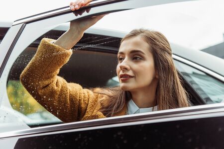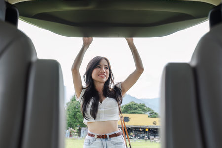 A beautiful young woman, sightseeing in nature, traveling by car on vacation, is closing the back door of the car to store things used in the travel trip. Traveling by private car