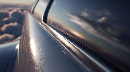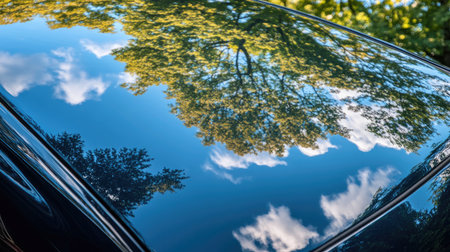 Smooth shiny surface of freshly waxed car paint, reflecting trees and blue sky