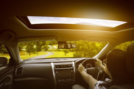 Woman driving car at countryside in sunrise or sunset, Outdoor freedom lifestyle concept