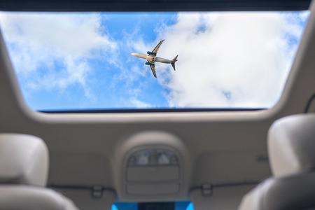 airplane from open hatch of the car during summer vacation. Travel and freedom concept
