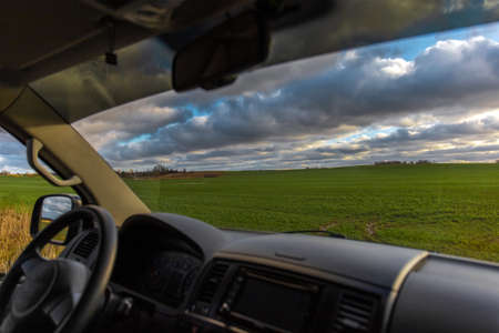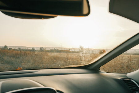 Car interior at sunrise on a forest road. Traveling with car concept. car insurance concept