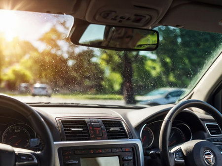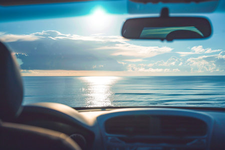 Looking through a car's interior at a peaceful seaside scene with calm waves and a bright sky. Generative AI