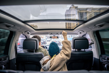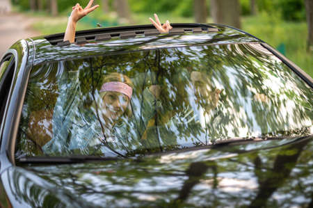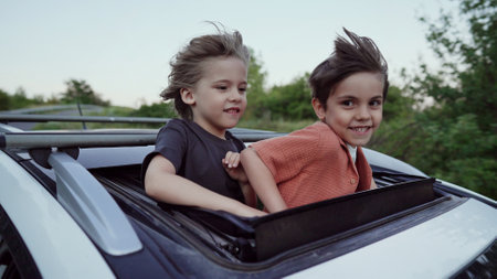 Funny Happy Little Boys Stands In Open Car Sunroof During Trip, Summer.childhood