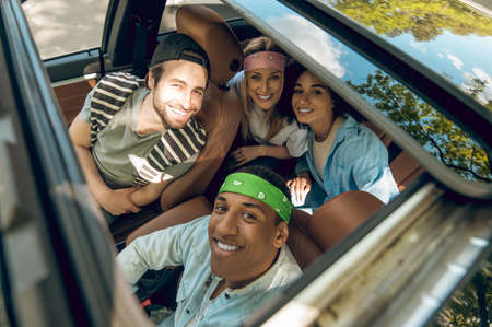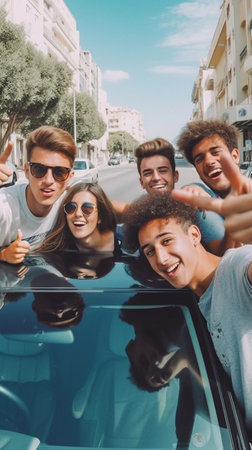 Generative AI : Group of friends having fun at car trip Four caucasian people on a sportive car with hands up