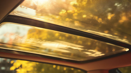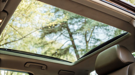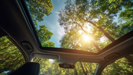 Experience breathtaking views from a car sunroof, with tall green trees swaying under a clear blue skyideal for adventure seekers and nature lovers seeking unique outdoor experiences