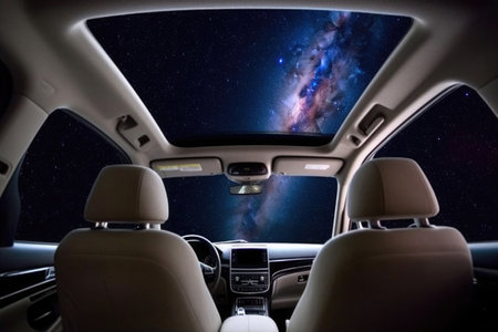 Car interior with galaxy and nebula background, first person view. Vehicle in space for futuristic travel. Creative spaceship. Created with Generative AI