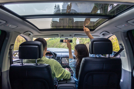 traveling by car of a young couple of a guy and a girl in plaid shirts