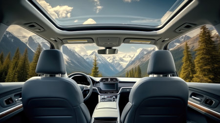 Interior of electric vehicle passenger seat with mountain view, Modern interior of car.