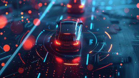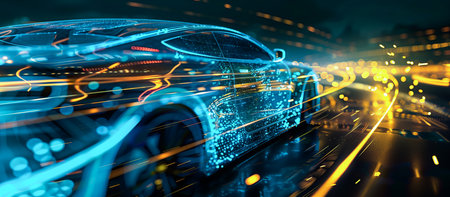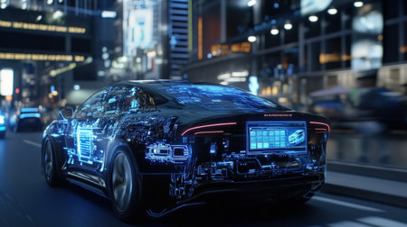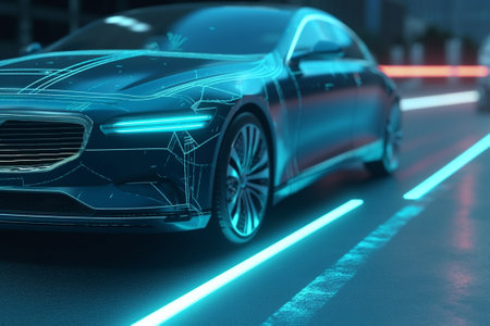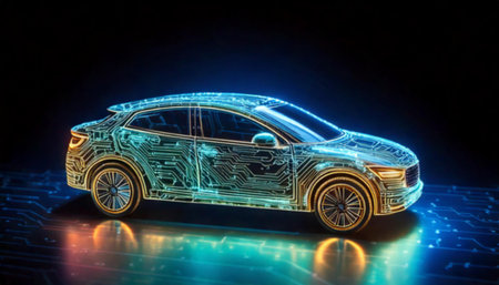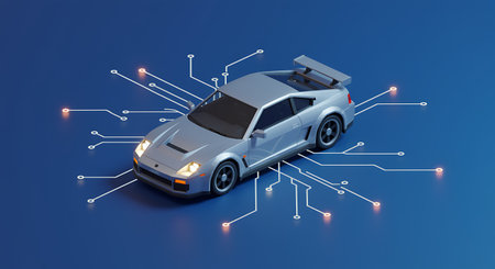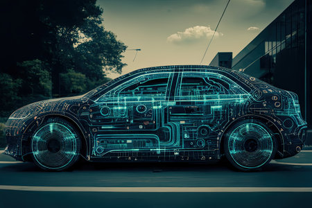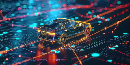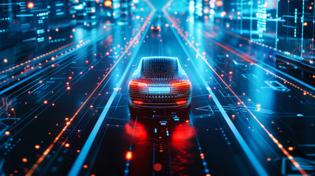 Digital Illustration of Smart Car with Luminous Tech Circuit Design Highlighting AI Integration