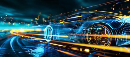A stunning representation of a futuristic car depicted in digital art style, blending speed and technology with neon lights and binary code.