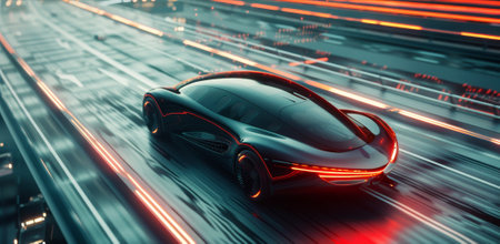 Sleek Car in Motion with Vibrant Light Trails Capturing the Essence of Speed and Modern Technology Against a Dark Background for Stock Photography