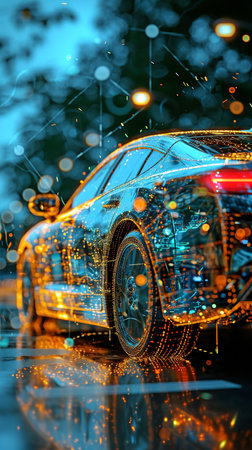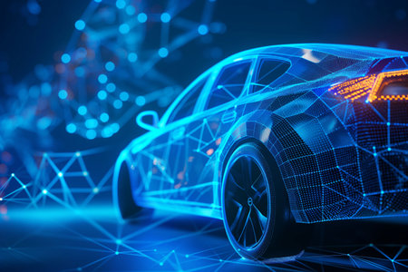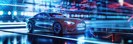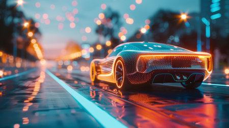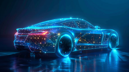 dynamic digital, car, blue illuminated points and lines, abstract geometric shapes. automotive design and testing, virtual reality simulations, and futuristic vehicle technology. High quality photo