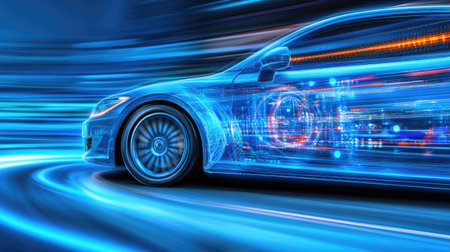 A sleek, blue sports car with a digital wireframe design speeds through a neon-lit tunnel, creating a sense of high-tech motion.