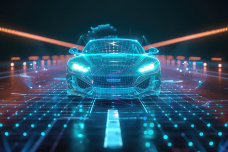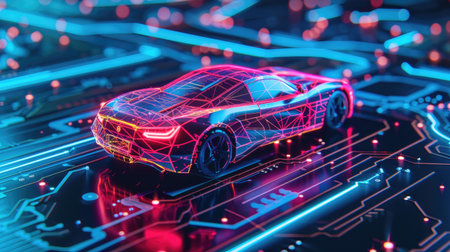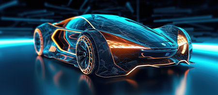 Futuristic sports car hologram with glowing neon elements on a digital background