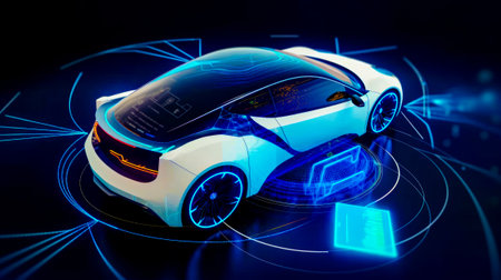 Futuristic Electric Car Design Concept with Digital Interface Overlay High Tech Autonomous Driving Systems Smart Vehicle Engineering Visualization with Glowing HUD Display, and Advanced Data Analytics