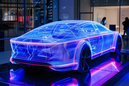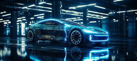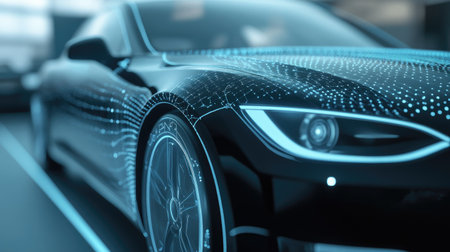 This image features a sleek, futuristic sports car designed with glowing digital elements, set in a modern studio environment, highlighting innovation in automotive design.