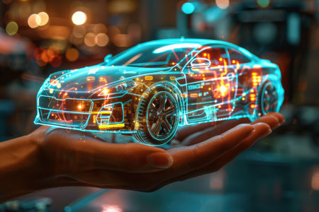 Futuristic automotive software analyzing hologram of modern car on transparent display