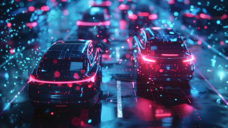 Autonomous vehicles driving on futuristic highway with digital overlay