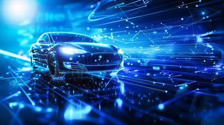 A sleek silver sports car sits poised on a vibrant blue background its headlights illuminating the scene Electronic circuit patterns spread outward from the vehicle suggesting a deep integration with digital networks and advanced technology The cars design reflects modern aesthetics hinting at high performance and cutting edge engineering This image is perfect for concepts related to autonomous vehicles electric cars connected transportation and the future of the automotive industry illustrating the convergence of vehicles and digital innovation