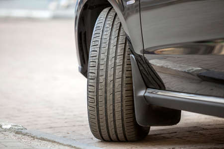 Close up detail part of car wheel with new black rubber tire protector on light blurred copy space background. Transportation, safety, reliability, modern design concept.