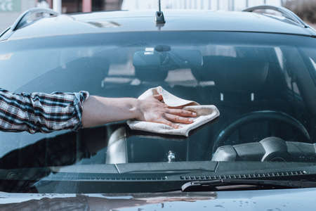 Human hand cleaning a dirty windshield with cloth, outdoor cropped shot