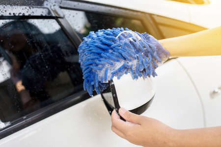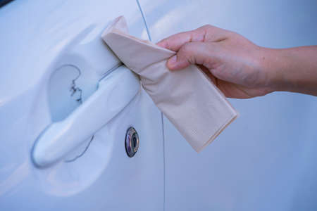 Car detailing series : Closeup of hand cleaning white car paint