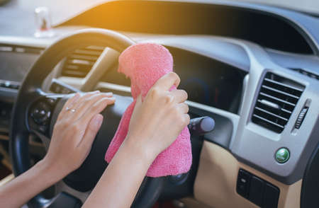 Young woman cleaning steering wheel in car with yellow wiper cloth, closeup detail to her hand