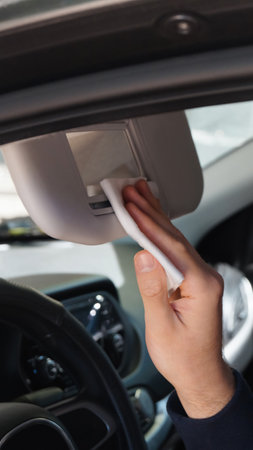 Man cleaning mirror with wet wipe in car, closeup. protective measures