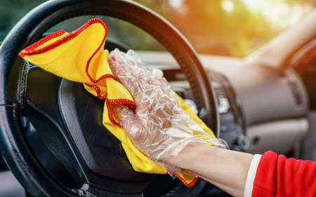 Man cleaning his car steering wheel for disinfection and a safe ride during the virus pandemic closeup