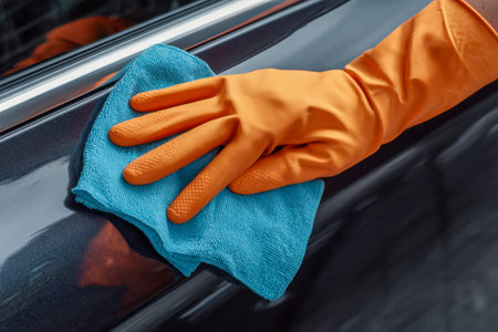 A person cleans the surface of a car with a blue microfiber cloth while wearing orange gloves in a bright auto detailing studio. Attention to detail is key.