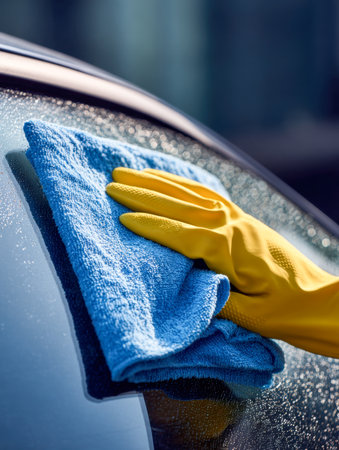 A gloved hand wipes a moist vehicle window with a vibrant blue cloth, captured in natural sunlight, highlighting precision during detailed car care.