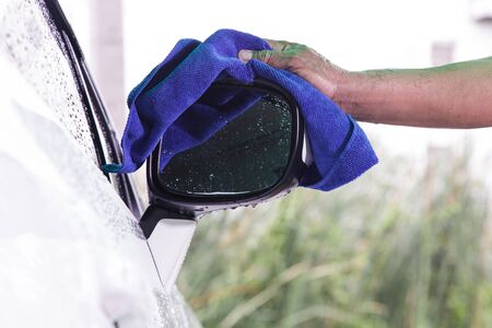 Cleaning car with green color microfiber cloth outdoor in holiday.