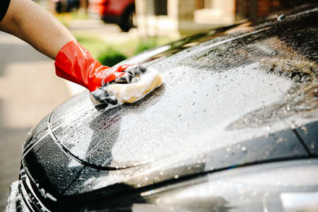 Man wash car using shampoo - every day life car care concept
