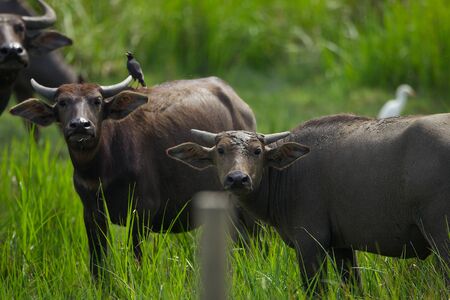 Asian water buffalo on the grassland with outdoor sunset lighting.