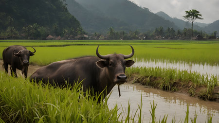 Thai buffalo in rice field, Bali island, Indonesia.