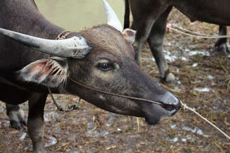 Closeup photo, portrait of Malaysian Water Buffalo with little horns, Langkawi, Malaysia. Wild life. Farm animals.
