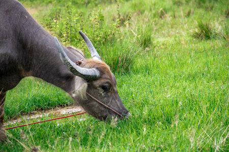 Large majestic water buffalo enjoying a meal of fresh green grass in a peaceful pasture setting