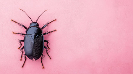 A striking close-up of a black cockroach on a soft pastel pink background, highlighting intricate textures and details, perfect for educational and artistic uses.