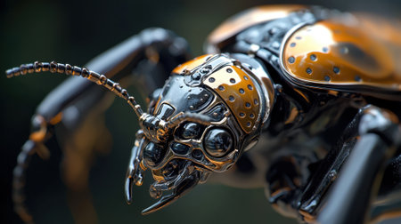 A bug with a metallic head and a black body. The bug is in a black and orange color scheme
