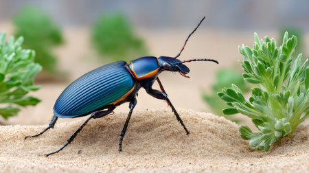 Colorful beetle with blue and yellow markings walking on a sandy surface