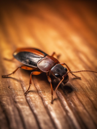 A detailed view of a beetle crawling on a tree bark, highlighting its shiny shell and the rough texture of the wood in the background
