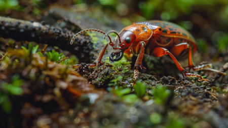 A stunning macro shot of a colorful beetle resting on a mossy log, showcasing intricate details and vibrant colors that highlight nature's beauty.
