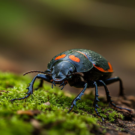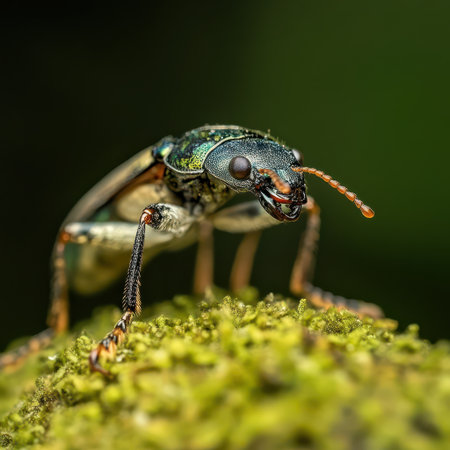 A stunning macro shot of a colorful beetle resting on a mossy log, showcasing intricate details and vibrant colors that highlight nature's beauty.