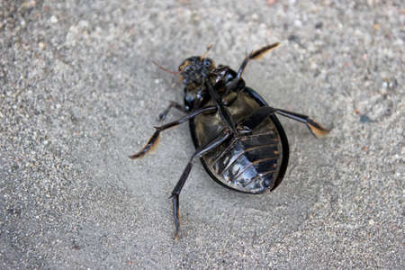 black beetle walking on wet ground
