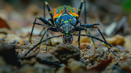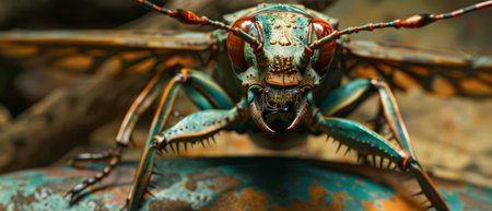 Vibrant macro shot iridescent beetle close up in jungle setting, gazing at camera