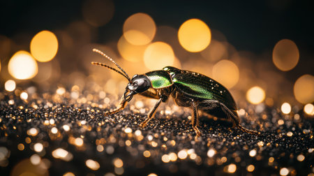 A vibrant green beetle is resting on a shiny black surface adorned with glowing golden lights capturing the festive spirit of Christmas.