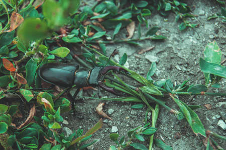 The stag beetle. A beetle in the red book. A very rare beetle. A beetle with horns in the wild.